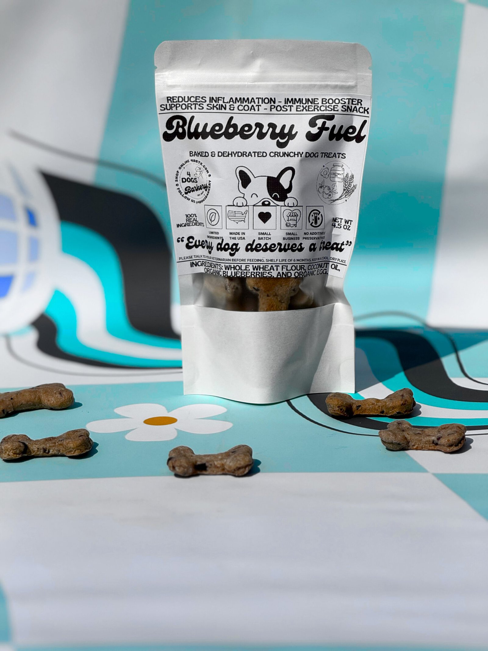 INGREDIENTS: Whole wheat flour, coconut oil, organic blueberries, and organic egg.